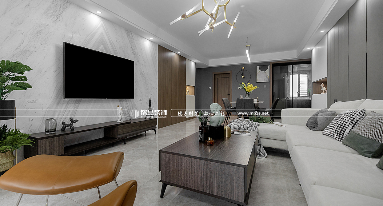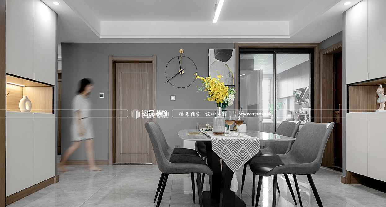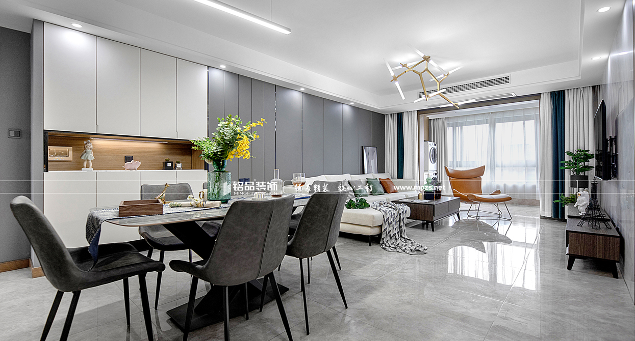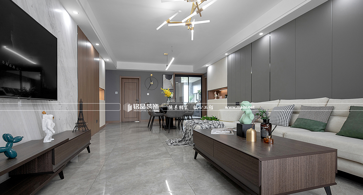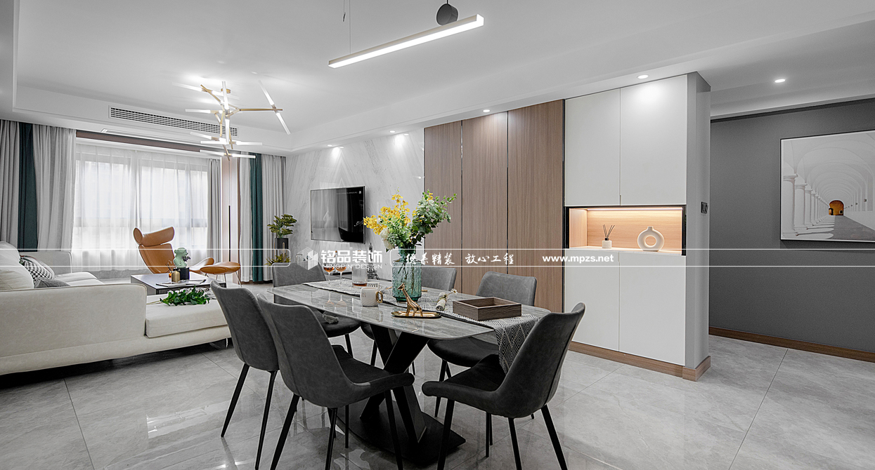 本案例房屋面积为126㎡,主要是公寓装修,以轻奢风格为主,色系以白色、灰色作为空间的主色,装饰主要体现空间通透奢华 ▲客厅空间是横厅布局,沙发右方是餐厅区域,侧边一旁落地窗,为空间带来明亮舒适的采光,在现代风的基调布置下,摆上简约舒适的家居,让空间显得从容而舒适,大理石纹路和木纹的木饰面电视北背景墙,布置上现代舒适的布艺沙发,还有木材质的茶几,褐色的休闲沙发椅、也让空间充满轻松自然的惬意感。 沙发右方布置现代精致的餐桌椅,在材与布艺质感的结合搭配下,呈现出一个华丽高级的用餐空间。 餐桌上轻奢精致的餐具、花盆与摆饰品,也让用餐氛围显得更加华丽情趣而有仪式感。 现代舒适的卧室空间,布置皮艺床与深绿色床单,床头区域摆上两个精致的床头柜,布置精致摆饰,简约温馨的空间,充满时尚优雅的质感。 次卧同样也是以蓝色的硬包为背景,布置木艺床与素雅的床单,呈现出的睡眠环境也安静温情。